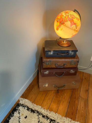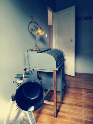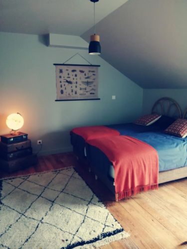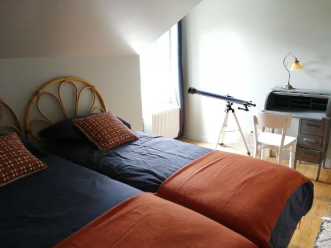 Elle est composée de 2 lits simples très moelleux et confortables de qualité hôtelière. Sa décoration soignée et chinée en fait une véritable invitation au voyage à l’esprit Jules Verne. Sa fenêtre donne sur le jardin. Deux toilettes sont à partager sur l’étage, ainsi que la salle de bain à l’esprit colonie de vacances.
