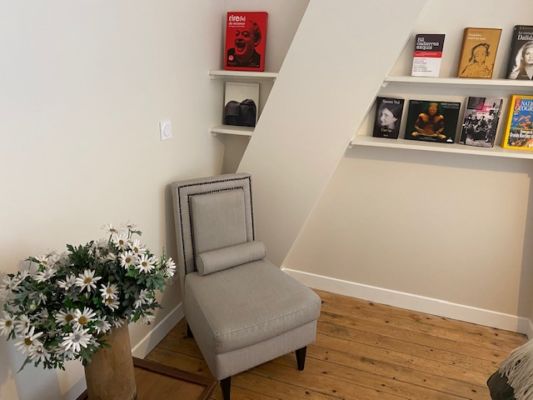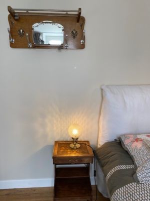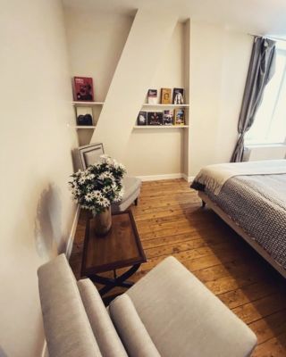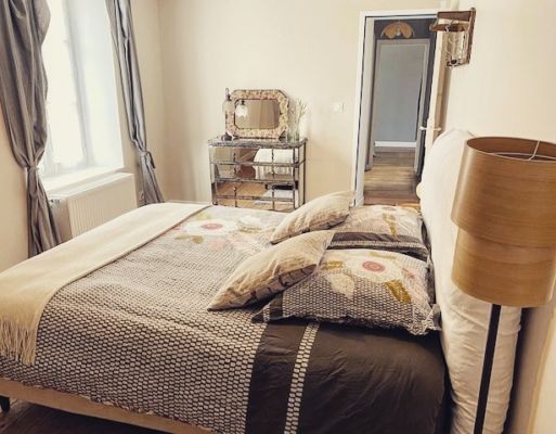 L’élégante chambre Chèvrefeuille de 20m2 est composée d’un lit de 160 gamme hôtellerie, et est décorée dans une ambiance reposante de campagne chic. Elle dispose d’une commode miroir, d’un porte-manteau mural avec un espace salon / bibliothèque. Elle est lumineuse et sa grande fenêtre donne une vue plongeante sur la cour.