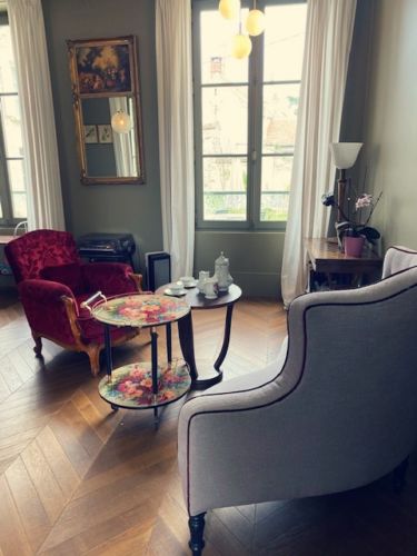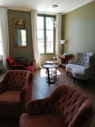 Cette pièce raffinée, aux tonalités kaki, lumineuse avec 4 grandes fenêtres en double exposition invite à se poser tout au long de la journée et profiter d’une vue imprenable sur l’extérieur (cour et jardin) avec une ambiance différente, selon l’heure et la luminosité.